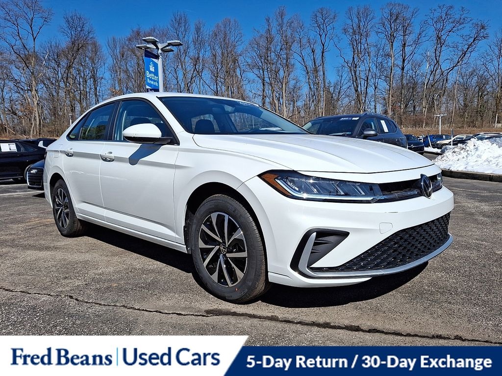 2025 Volkswagen Jetta 1.5T S 1.5L I-4 DI DOHC Turbocharged 8-Speed Automatic with Tiptronic FWD 4D Sedan Pure White Great Service History, Remainder of Factory Warranty, Factory Certified Vehicle, Auto Reward Program, Titan Black w/Cloth Seat Trim.