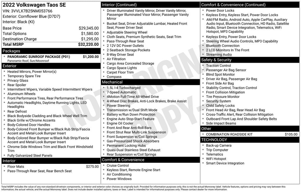 Powered by a 1.5L I4 Turbocharged DOHC 16V engine, the Taos 1.5T SE delivers an impressive 158 horsepower and an efficient 25 city / 32 highway mpg, making it the perfect companion for your daily commute or weekend adventures. With its advanced All-Wheel Drive system, you'll enjoy confident handling and exceptional traction, no matter the road conditions.